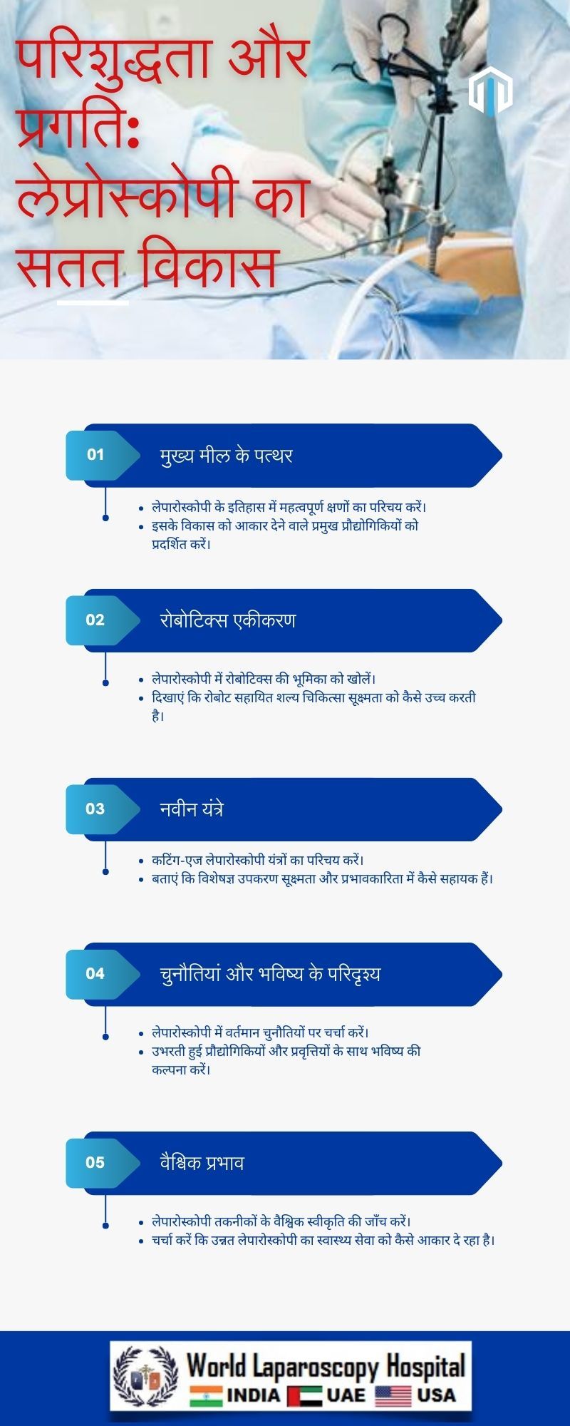 परिशुद्धता और प्रगति के साथ लैपरॉस्कोपी का सतत विकास चिकित्सा क्षेत्र में एक महत्वपूर्ण मील का पत्थर है। इस तकनीक के सुधारों ने चिकित्सा स्तर को बढ़ावा दिया है और मरीजों को अधिक प्रेसिजन और तेजी से इलाज की सुविधा प्रदान की है। हमें यहां से आगे बढ़कर इस तकनीक को और भी समृद्धि देने के लिए नई दिशा में कदम बढ़ाना होगा, ताकि हम समृद्धि, सेफटी, और सुरक्षित स्वास्थ्य की दिशा में नए होरिजन्स को छू सकें।